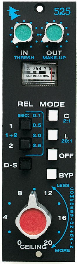 Po velmi úspěšných a populárních preampových a ekvalizérových modulech není překvapivé, že API přichází i s kompresorem. Modul API 525 může zvukově připomínat slavný 1176 kompresor. Obsahuje v sobě všechny nastavitelné funkce kompresoru (attack, release, ratio, threshold, input gain, output gain) a navíc i velmi užitečný De-esser. Modul 525je p5esnou kopií originálu ze 70.let a představuje „feedback“ typ kompresoru – podobně jako zmíněný 1176 nebo slavný Fairchild 660. Přídavná speciální „ceiling“ funkce umožňuje jemné vyladění úrovně komprese. Svými mimořádnými zvukovými kvalitami je tento modul pro každého „lunchbox“ uživatele téměř nepostradatelný
